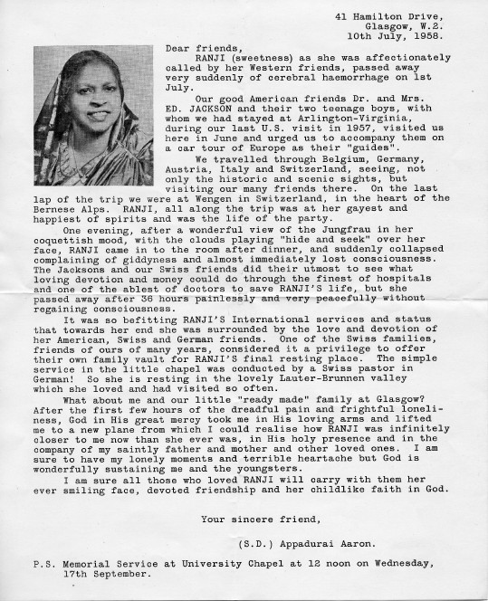 Announcement of death of Ranji Aaron from Appadurai Aaron